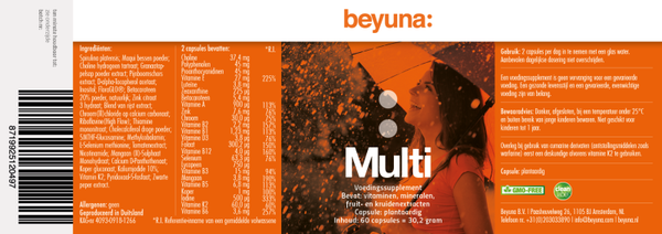 Beyuna Multi heeft een vernieuwde, optimaal opneembare samenstelling en is Clean Label samengesteld, dit houdt in dat het geen vul-, hulp- of kleurstoffen bevat.